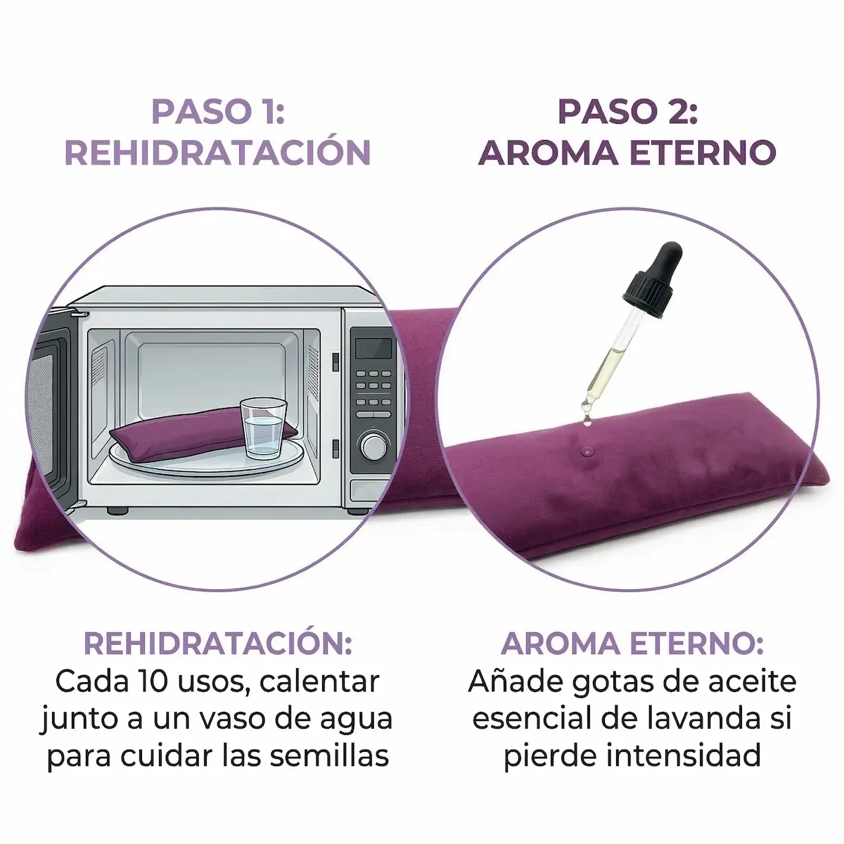Si lo usas con mucha frecuencia, las semillas que hay en su interior se acabarán secando. Por eso es importanto que cada 10 usos, metas en el microondas el saco térmico de lavanda junto con un vaso de agua. ¿Para qué? El vapor rehidratará las semillas y hará que dure mucho más tiempo.