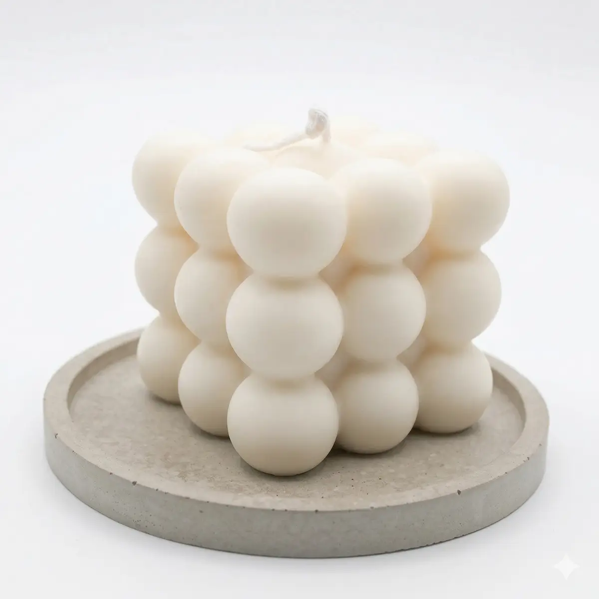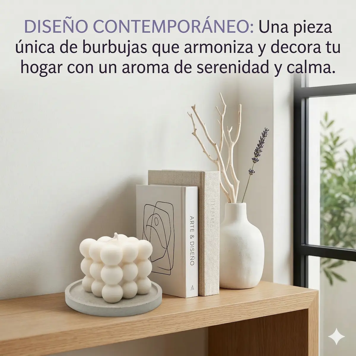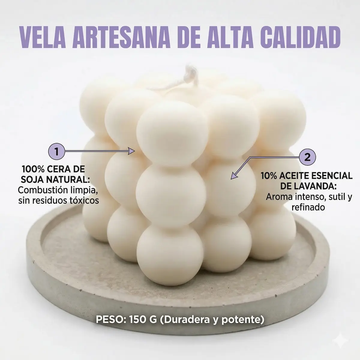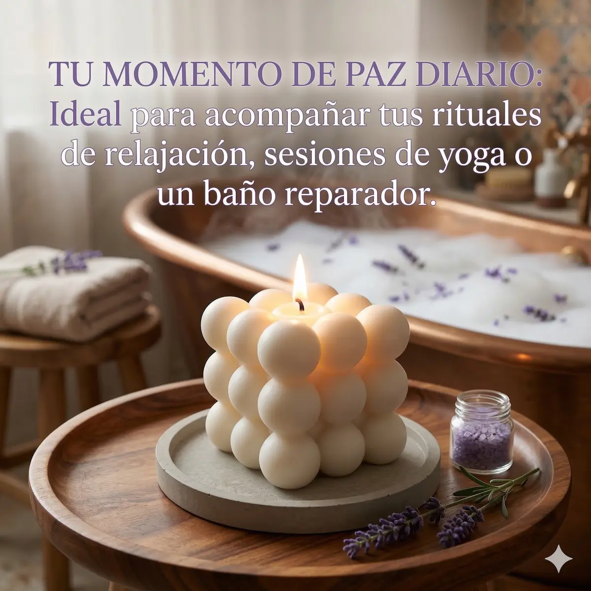 Nuestra Vela de Lavanda de 150 g está hecha con un 10% de aceite esencial y cera de soja natural. Tiene un diseño moderno y original en forma de burbujas (como muestra la fotografía), que ayuda a que el aroma se disperse de manera única al quemarse.